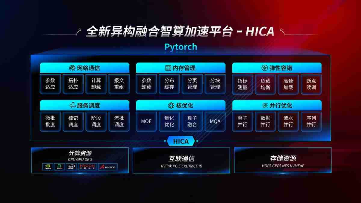 通过自研的服务层、、、中间适配层、、以及调度编排算法,,,,采用数据并行、、、模型并行等多种并行方式,,,,把并行计算任务进行有效的分解,,,使其分别由相应的软件栈和算力资源来承接。。当GPU资源变化,,,,HICA可以实时动态调度计算子任务并调整模型拓扑和架构,,,以充分聚合各种算力资源。。