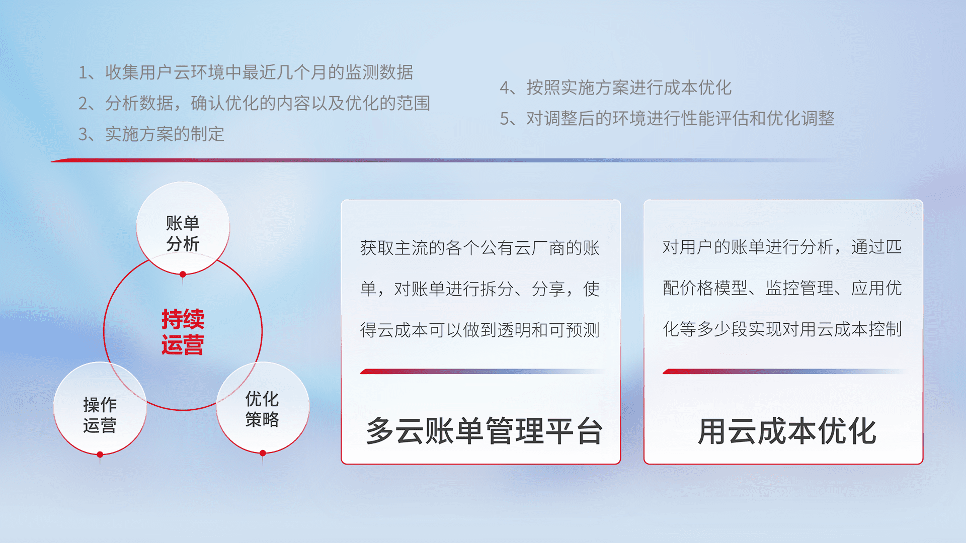 通过多云纳管,,,以统一的资源数据模型把客户的云资源进行抽象和封装,,进而实现对多云资源的统一操作,,保障云资源管理的可靠性、、、、稳定性与可用性。。。量身定制化运维内容,,配置、、、开发运维、、补丁管理、、、备份、、监控、、认证和访问管理、、、、审计和日常巡检等,,,保障在用云过程中的可靠度,,,稳定度以及高可用率。。。
